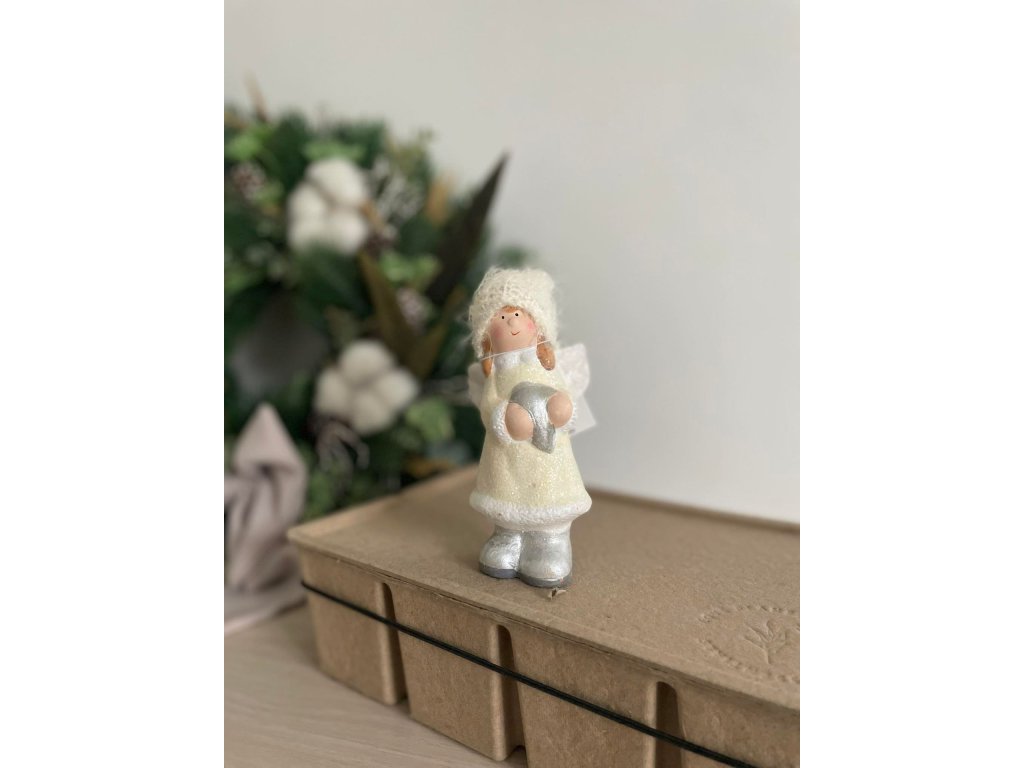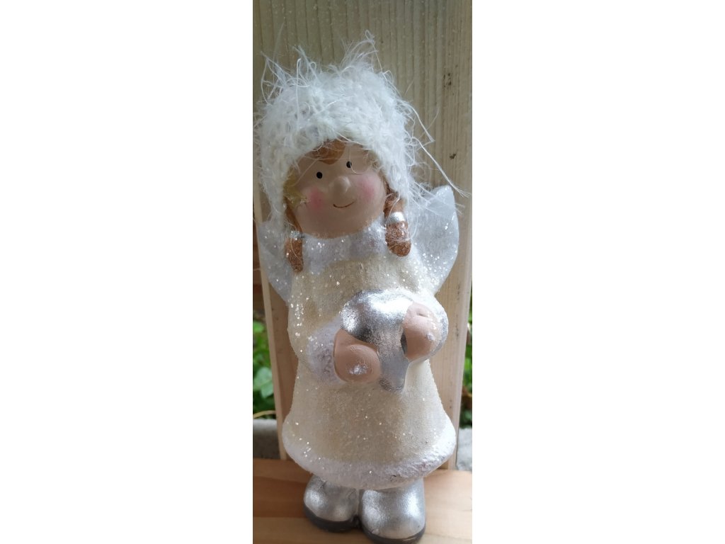 Keramický anjelik s pletenou čapicou. Výška: 14,5cm