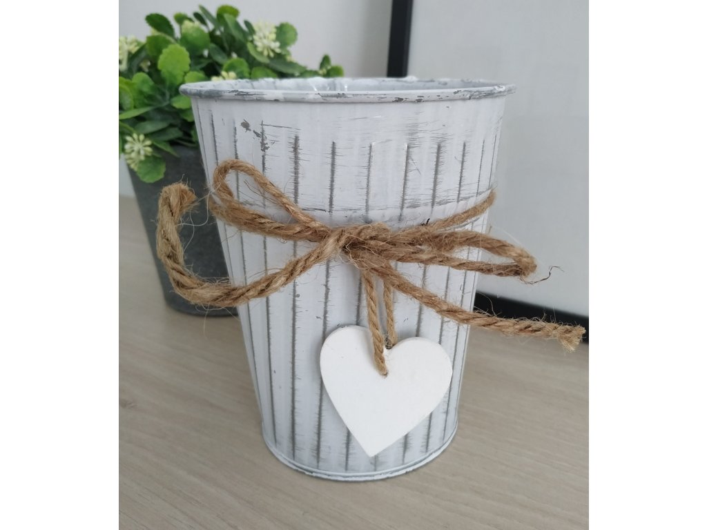 Kovový obal previazaný povrazkom na ktorom je zavesené drevené srdiečko. Výška 13,5cm Priemer horný vnútorný 10,5cm Spodný priemer: 7,9cm Bez umelej dekorácieBuďte prvý, kto napíše príspevok k tejto položke.