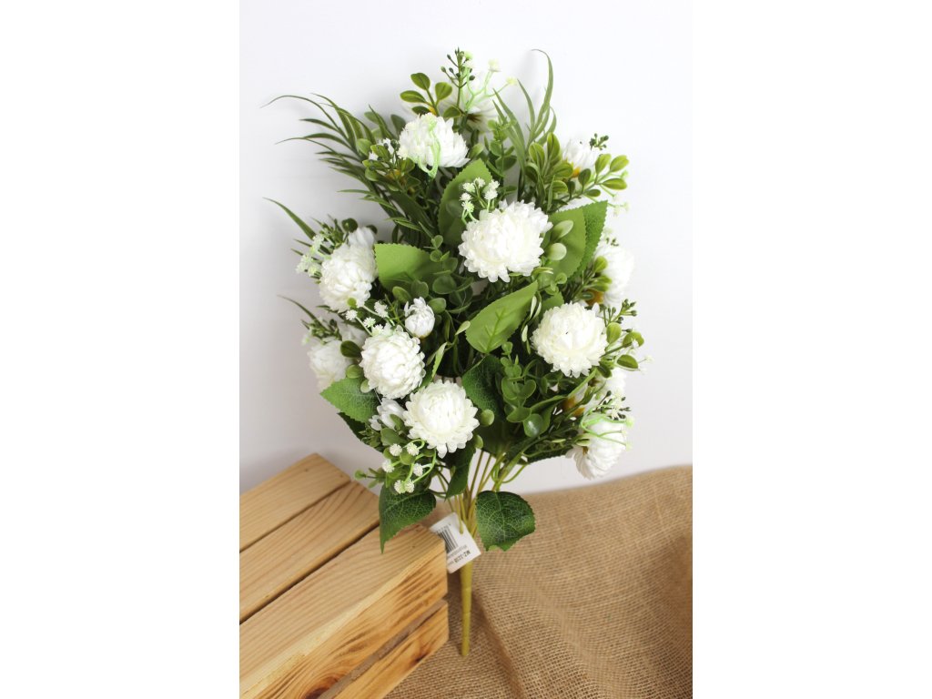 Kvety sú doplnené bohatou zelenou výplňou z rôznych druhov listov a drobných kvietkov, čo aranžmánu dodáva prirodzený a plný vzhľad. Vďaka kvalitnému spracovaniu vyzerá veľmi realisticky a je vhodná na dekorovanie interiéru, výrobu vencov či smútočných ikebán. Biela farba chryzantém symbolizuje čistotu a úctu, takže sa hodí aj na pietne príležitosti.