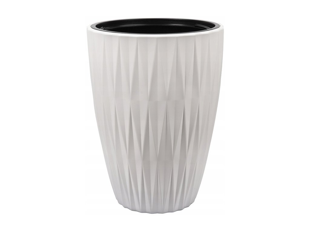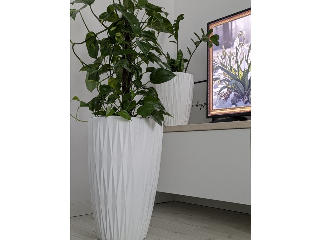 Kvetináč je vhodný pre okrasné trávy, menšie stromčeky, izbové aj vonkajšie rastliny. Biely farebný odtieň pôsobí čisto a elegantne a ľahko sa kombinuje s ostatnými doplnkami.
