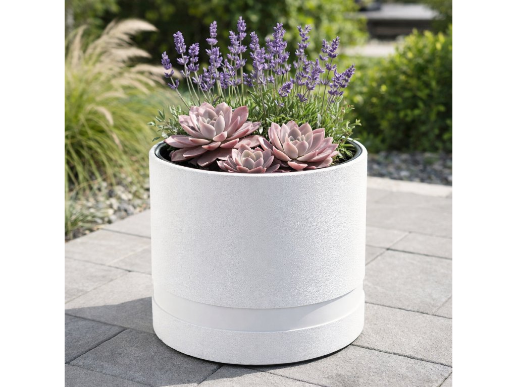 Valcový kvetináč KOMA s priemerom 380 mm je moderným a praktickým riešením pre interiér aj exteriér. Vyrobený z kvalitného plastu, ktorý je odolný voči mrazu, UV žiareniu a vlhkosti, vďaka čomu je vhodný na celoročné používanie bez obáv z poškodenia.