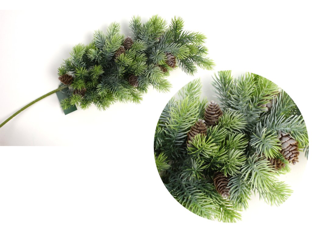 Luxusná umelá smreková vetvička vyrobená zo silikónového materiálu s realistickým vzhľadom a prírodným prevedením. Obsahuje jemne tvarované ihličie v odtieňoch zelenej doplnené drobnými hnedými šiškami, ktoré dodávajú autentický zimný vzhľad.