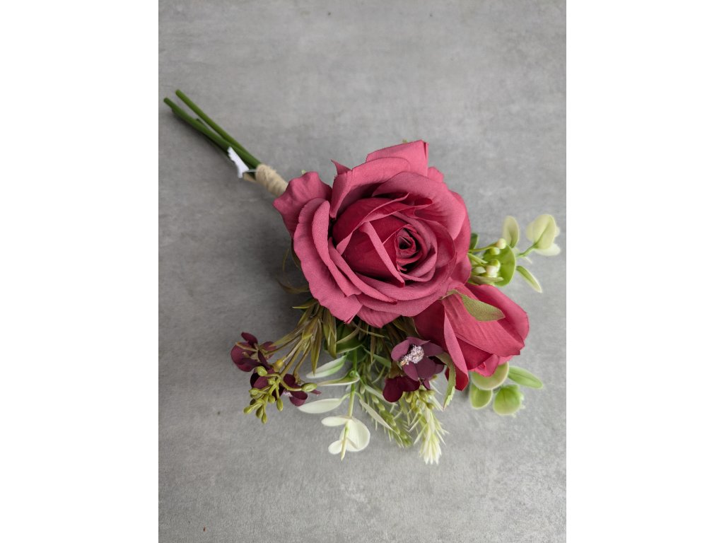 Umelá kytica s výraznou bordovou ružou doplnená o drobné kvety a zelené lístie vytvára príjemný, prirodzený vzhľad. Hodí sa do váz, aranžmánov aj dekorácií, kde dodá priestoru farbu a charakter. Ideálna voľba pre tých, ktorí chcú mať kvety krásne po celý rok – bez starostlivosti.